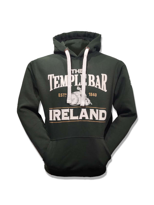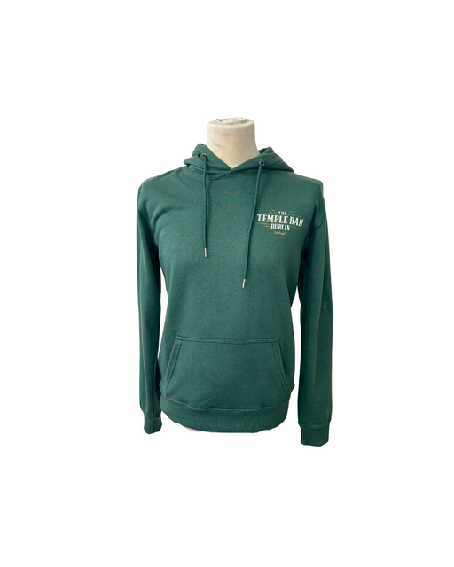 A classic, comfortable green pullover hoodie featuring "The Temple Bar Dublin" circular logo on the chest and on the back.
