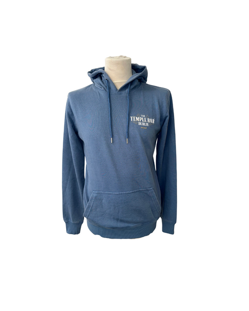 A soft, washed blue hoodie with a drawstring hood and a subtle "The Temple Bar Dublin" logo on the front, and larger "The Temple Bar Dublin" crest ...