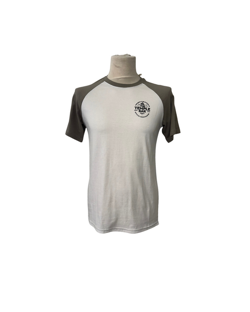 A stylish two-tone grey and white raglan-style t-shirt with a small "The Temple Bar Dublin" logo on the front and a larger official "The Temple Bar...